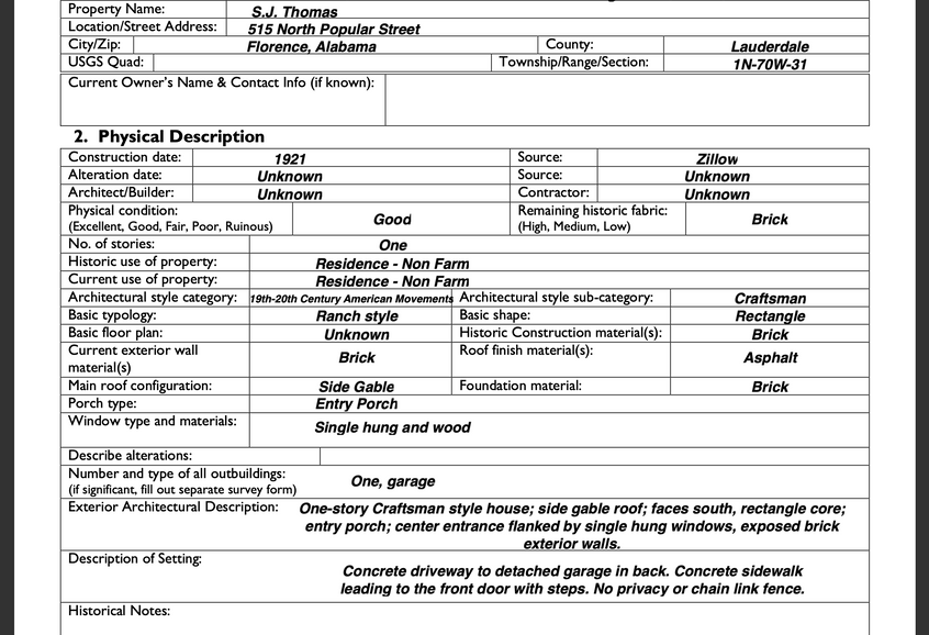 This project involved conducting a historic district survey of Walnut Street in Florence, Alabama, with the goal of updating its 1976 National Register nomination and exploring potential district expansion. I documented the current condition of historic buildings through detailed surveys, photographs, and a comprehensive historical narrative. Using tools like Excel, survey forms, and USGS mapping, I updated existing listings, assessed properties on the district’s edges for inclusion, and compiled a history of the district’s development.